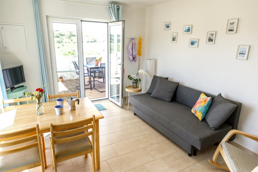 Es gibt T1 Apartments für zwei Personen und T2 Apartments für vier Personen. Durch die Sofabetten (70x185cm) im Wohnzimmer ist es möglich, dass im T1 Apartment vier Personen schlafen und im T2 Apartment bis zu sechs Personen. Das T2 Mos Apartment ist dabei größer als das T2 Canavial Apartment und hat einen Balkon mit Blick aufs Meer und den Garten mit Pool. Es stehen auch Kinderbetten und Hochstühle gegen einen geringen Aufpreis zur Verfügung.