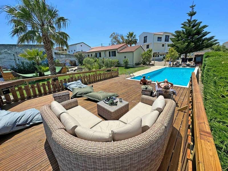 Das großzügig angelegte Gelände bietet unzählige Möglichkeiten, sich neben dem Surfen weiter auszupowern oder zu relaxen. Auf dem eigenen Beachvolleyballfeld im Garten (mit Flutlicht) könnt ihr euch spannende Spiele liefern und beim wöchentlich stattfindenden Beachvolleyball-Fun-Turnier satte Preise abgreifen. Zum Abkühlen lädt der eigene Pool ein. Wer einfach nur zugucken oder relaxen möchte, kann es sich in einer der Hängematten oder Liegestühle gemütlich machen. Für die Skater unter euch gibt es eine Miniramp im Garten. Außerdem stehen Kicker, Slackline, Trampolin, Dart und Tischtennisplatte zur Verfügung.